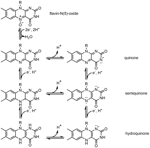 Одним из примеров кофермента является Флавин. Он содержит отдельную конъюгированную изоаллоксазиновую кольцевую систему. Флавин имеет несколько окислительно-восстановительных состояний и может использоваться в процессах, связанных с переносом одного или двух электронов. Он может действовать как акцептор электронов в реакции, такой как окисление НАД до НАДН, принимать два электрона и образовывать 1,5-дигидрофлавин. С другой стороны, он может образовывать семихинон (свободный радикал), принимая один электрон, а затем превращаться в полностью восстановленную форму путем добавления дополнительного электрона. Это свойство позволяет использовать его в процессе одноэлектронного окисления.