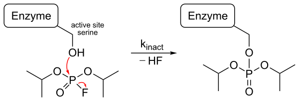 Диизопропилфторфосфат (DIFP) — необратимый ингибитор, блокирующий действие сериновой протеазы. Когда он связывается с ферментом, происходит реакция нуклеофильного замещения с высвобождением одной молекулы фтороводорода. Группа ОН в активном центре действует как нуклеофил, атакуя фосфор в DIFP, образуя тетраэдрический промежуточный продукт и высвобождая протон. Затем связь PF разрывается, один электрон переносится на атом F, и он оставляет промежуточное соединение в виде F- аниона. Он соединяется с протоном в растворе с образованием одной молекулы HF. Между активным центром и DIFP образуется ковалентная связь, поэтому боковая цепь серина больше не доступна для субстрата[17].