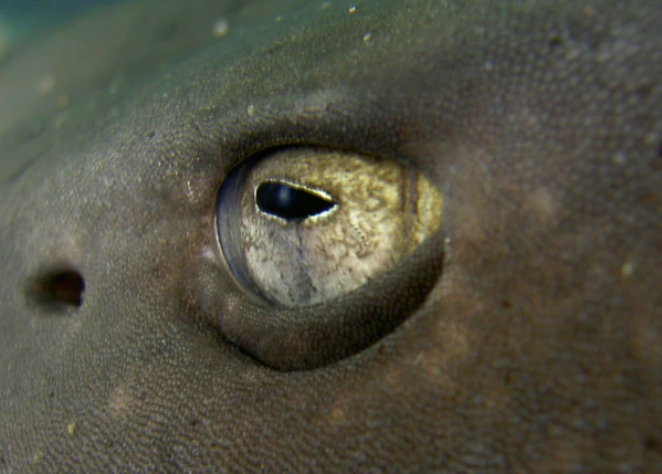 Строение глаза акулы по большей части такое же, как и у всех позвоночных, но с некоторыми особенностями. Глаз акулы имеет особый отражающий слой — тапетум — расположенный позади сетчатки. Тапетум направляет прошедший сквозь сетчатку свет обратно, чтобы он ещё раз воздействовал на рецепторы, таким образом усиливая чувствительность глаза. Это существенно повышает остроту зрения, особенно в условиях недостаточной освещённости. Ещё одной особенностью у некоторых видов является наличие моргающего века, которое закрывает глаз непосредственно во время атаки на жертву, защищая его от повреждений[23]. Акулы, не имеющие моргающего века, при атаке жертвы закатывают глаза[24]. Ранее полагали, что глаз акулы содержит слишком мало колбочек и не способен различать цвета и мелкие детали. Однако современные технологии позволили доказать обратное. Зрение некоторых видов акул острее человеческого до 10 раз[24].