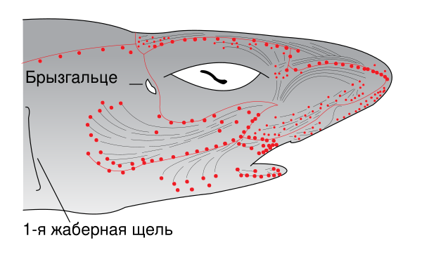 Электрорецепторный аппарат акул представлен ампулами Лоренцини — это погружённые в кожу маленькие соединительнотканные капсулы с исходящими от них трубочками, которые открываются на поверхность кожи. Акулы реагируют на электрические поля напряжённостью всего 0,01 мкВ/см. Поэтому они способны обнаруживать жертву по электрическим полям, создаваемым работой дыхательных мышц и сердца[9]. Есть предположения, что они используются акулой и в качестве термодатчиков, определяющих температуру среды с точностью до 0,05 °C[13].