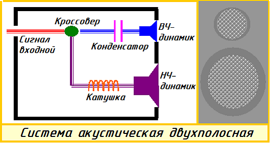 - 2-полосная схема (НЧ/СЧ + ВЧ динамик)
