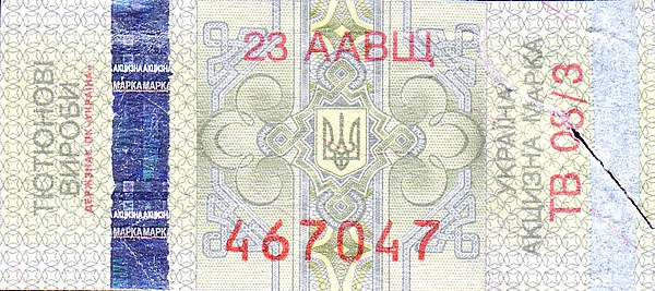 На Украине акцизный сбор был утверждён Указом Президента Украины от 18 сентября 1995 года «Об утверждении акцизного сбора на алкогольные напитки и табачные изделия». 24 октября 1996 года вышло постановление Кабинета министров Украины «Об утверждении Положения о производстве, хранении, продаже марок акцизного сбора и маркирования алкогольных напитков и табачных изделий и порядка реализации или уничтожения конфискованных алкогольных напитков и табачных изделий», которое вводило в обращение на территории Украины акцизные марки[5].