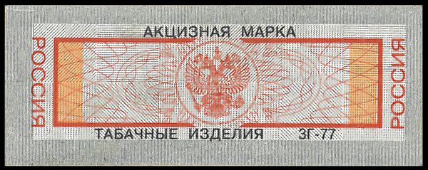 - Для маркировки табака и табачных изделий, ввозимых на территорию Российской Федерации с территорий иностранных государств, входящих в Содружество Независимых Государств и Таможенный союз, на территории особых экономических зон отдельных субъектов Российской Федерации в соответствии с таможенным режимом свободной таможенной зоны. Эти марки с левой и правой стороны имеют полосы коричневого цвета. Полоса на левой стороне под воздействием ультрафиолетового излучения светится жёлтым цветом. Тонкие пунктирные и гильоширные линии сетки, а также рамка плавно переходят из оранжевого цвета в зелёный.