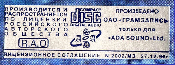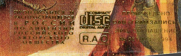 Во второй половине 1990-х (не позднее 1996 года) на лицензионные диски (CD и виниловые) клеилась на лицевую сторону обложки беззубцовая марка-наклейка РАО (Российского общества по охране авторских прав).