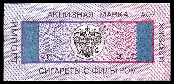 - Для маркировки табака и табачных изделий, происходящих и ввозимых на территорию Российской Федерации с территорий иностранных государств, не входящих в Содружество Независимых Государств и Таможенный союз. Эти марки имеют с левой и правой стороны полосы синего цвета. Полоса на левой стороне под воздействием ультрафиолетового излучения светится зелёным цветом. Тонкие пунктирные и гильоширные линии сетки, а также рамка плавно переходят из розового цвета в синий (согласно приказу ГТК РФ и Минфина РФ от 9 июля 2003 года № 760/63н — из синего цвета в розовый).