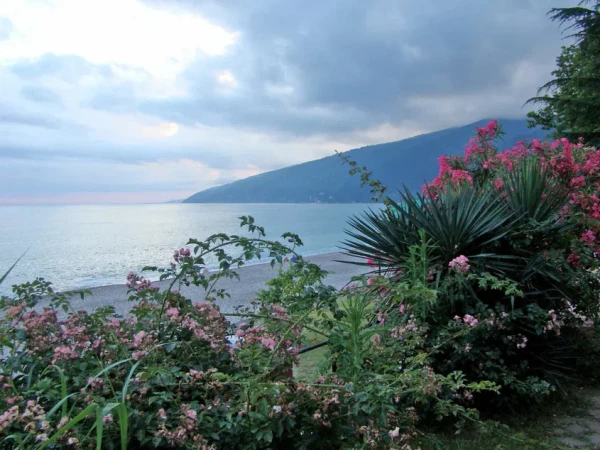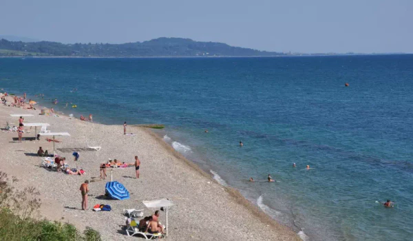 Пляж находится на равнине, но вокруг возвышаются горы[5]. С пляжа открывается вид на Гагрский хребет.