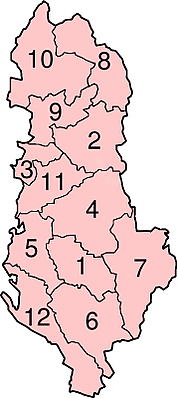 Территория Албании делится на 12 областей (алб. qark, мн. ч. — qarqe), которые ранее делились на 36 округов (алб. rreth, мн. ч. — rrethe, рети) и 373 муниципалитета. Каждый округ имел свой совет, состоящий из нескольких муниципалитетов. В 2015 году была проведена административно-территориальная реформа, в результате которой административное деление изменилось, количество областей осталось прежним, но теперь они подразделяются на 61 муниципалитет, в состав которых входят коммуны[75].