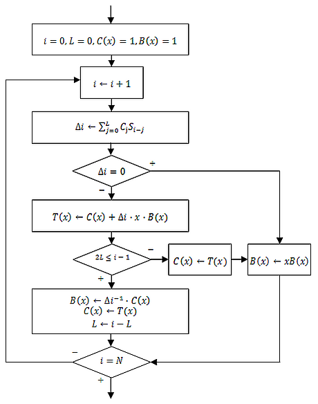 Алгоритм: C(x) инициализирован величиной 1, L обозначает текущее количество найденных ошибок на данный момент, и инициализирован нулём. N — общее количество элементов синдрома ошибки. n — главный счётчик, он же индекс элементов синдрома от 0 до (N-1). B(x) — копия последнего C(x) на момент обновления L, и инициализируется 1. b — копия последнего расхождения d (см.ниже) опять же, на момент обновления L и инициализируется 1. m — номер итераций, прошедших с обновления L, B(x), and b и тоже инициализирован единицей.