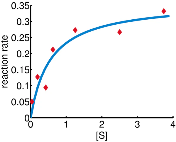 В экспериментальной биологии изучение связей между концентрацией субстрата [S] и скоростью реакции в реакции энзимомодуляции, были получены следующие данные.