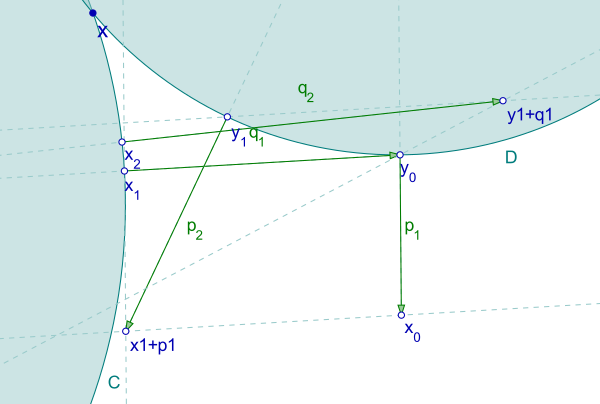 Сначала рассмотрим метод поочерёдного проецирования (типа POCS) (который исследовал первоначально для случая, когда множества являются линейными подпространствами, Джон фон Нейман[1]). Метод стартует с точки и создаёт последовательность