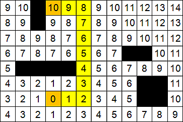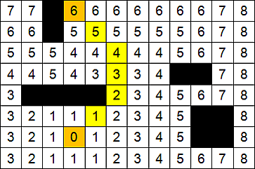Далее, от стартовой ячейки порождается шаг в соседнюю ячейку, при этом проверяется, проходима ли она, и не принадлежит ли ранее меченной в пути ячейке.