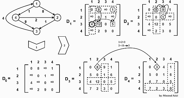 До первой рекурсии внешнего цикла, обозначенного выше k = 0, единственные известные пути соответствуют отдельным ребрам в графе. При k = 1 находятся пути, проходящие через вершину 1: в частности, найден путь [2,1,3], заменяющий путь [2,3], который имеет меньше ребер, но длиннее (с точки зрения веса ). При k = 2 находятся пути, проходящие через вершины 1,2. Красные и синие прямоугольники показывают, как путь [4,2,1,3] собирается из двух известных путей [4,2] и [2,1,3], встреченных в предыдущих итерациях, с 2 на пересечении. Путь [4,2,3] не рассматривается, потому что [2,1,3] - это кратчайший путь, встреченный до сих пор от 2 до 3. При k = 3 пути, проходящие через вершины 1,2,3 найдены. Наконец, при k = 4 находятся все кратчайшие пути.