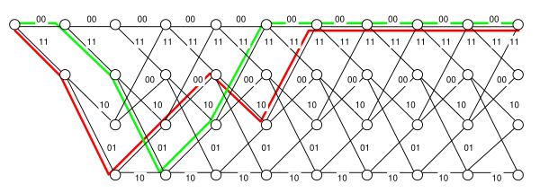 Рассмотрим работу декодера Витерби на простом примере. Полагаем, что кодирование производится с использованием свёрточного (7,5)-кода. Пользуясь решётчатой диаграммой кодера, попытаемся, приняв некоторый сегмент , проследить наиболее вероятный путь кодера. При этом для каждого сечения решётчатой диаграммы будем отмечать меру расходимости пути к каждому её узлу. Предположим, что передана кодовая последовательность U = (00000000…), а принятая последовательность имеет вид r = (10001000…), то есть в первом и в третьем кадрах кодового слова возникли ошибки. Как мы уже убедились, процедура и результат декодирования не зависят от передаваемого кодового слова и определяются только ошибкой, содержащейся в принятой последовательности. Поэтому проще всего считать, что передана нулевая последовательность, то есть U = (00000000…). Приняв первую пару символов (10), декодер определяет меру расходимости для первого сечения решётки, приняв следующую пару символов (00), — для второго сечения и т. д. При этом из входящих в каждый узел путей оставляем путь с меньшей расходимостью, поскольку путь с большей на данный момент расходимостью уже не сможет стать в дальнейшем короче. Заметим, что для рассматриваемого примера начиная с четвёртого уровня метрика (или мера расходимости) нулевого пути меньше любой другой метрики. Поскольку ошибок в канале больше не было, ясно, что в конце концов в качестве ответа будет выбран именно этот путь. Из этого примера также видно, что выжившие пути могут достаточно долго отличаться друг от друга. Однако на шестом-седьмом уровне первые семь рёбер всех выживших путей совпадут друг с другом. В этот момент согласно алгоритму Витерби и принимается решение о переданных символах, так как все выжившие пути выходят из одной вершины, то есть соответствуют одному информационному символу.