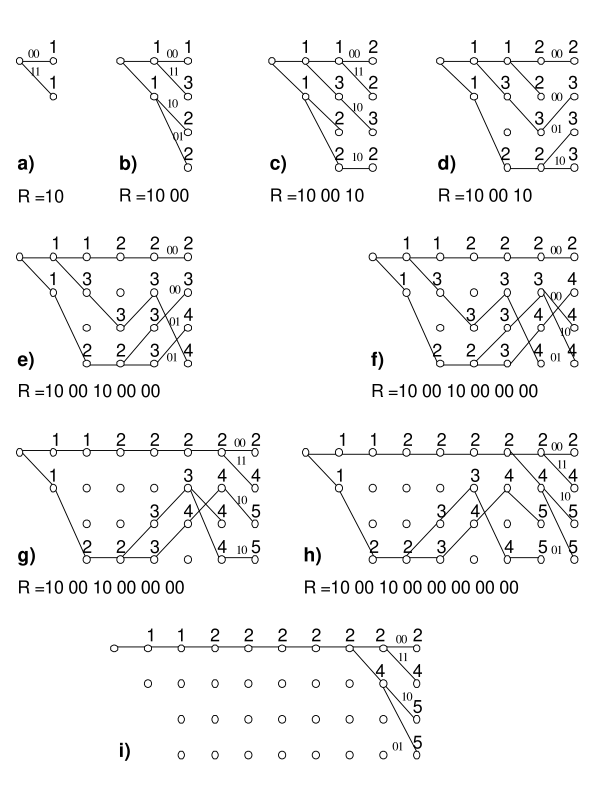 На шаге i) степень различия метрик правильного и неправильного путей достаточно велика (, ), то есть в данном случае можно было бы ограничить глубину декодирования величиной . Но иногда более длинный к данному сечению путь может оказаться в конечном итоге самым коротким, поэтому особенно увлекаться уменьшением размера окна декодирования b с целью упрощения работы декодера не стоит. На практике глубину декодирования обычно выбирают в диапазоне , где — число исправляемых данным кодом ошибок. Несмотря на наличие в принятом фрагменте двух ошибок, его декодирование произошло без ошибки и в качестве ответа будет принята переданная нулевая последовательность.