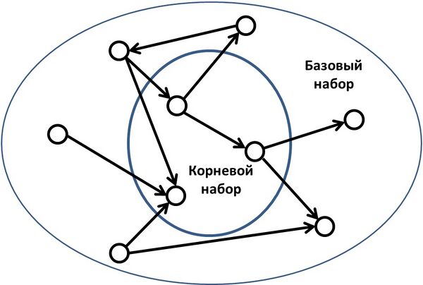 Первым шагом в алгоритме HITS, является получение наиболее релевантных страниц в поисковом запросе. Это множество называется корневым набором и может быть получено путём принятия самых популярных страниц n, возвращаемых текстовым алгоритмом поиска. Базовый набор формируется путём увеличения корневого набора со всеми веб-страницами, которые с ним связаны и с некоторыми страницами, ссылающимися на него. Веб-страницы в базовом наборе и все гиперссылки между этими страниами, образуют сосредоточенный подграф. HITS вычисления выполняются только на этом подграфе.