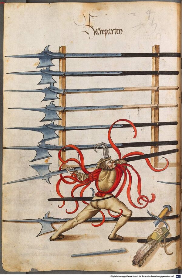 Описание приёмов владения алебардой содержится, в частности, в турнирной книге императора Максимилиана I «Фрейдал» (1512—1515), а также в рукописном фехтовальном трактате чиновника и хрониста из Аугсбурга Пауля Гектора Майра (1542—1544 гг.), проиллюстрированном художником Йоргом Броем младшим.