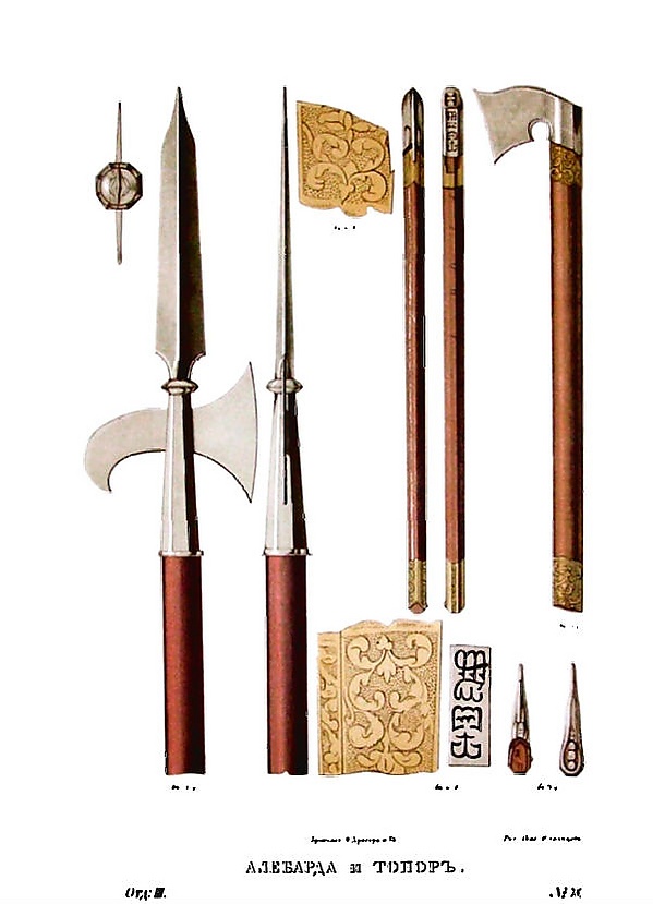 «… Орудие это, на первый взгляд и особенно издали казавшееся страшным, а в действительности очень тяжёлое и неудобное для какого-либо употребления, стесняло, конечно, хожалых, не обладавших крепостью и выправкой средневековых ландскнехтов, и они часто пребывали без алебарды, оставив её или у своей будки или прислонив к забору.»