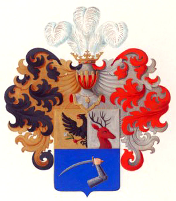 Щит полурассечён-пересечён. В первой, золотой части, выходящий с левого бока чёрный орёл, с червлёными глазами, клювом, языком и когтями, держащий лилию натурального цвета. Во второй, серебряной части, червлёная оленья голова влево. В третьей, лазоревой части, в серебряных латах рука, держащая такой же, с золотою рукоятью меч, влево.