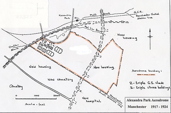 После закрытия аэродрома Траффорд Парк в 1918 году,[2] Александра-Парк был построен и открыт в мае 1918 года Военным министерством для сборки, испытательных полётов и передачи самолётов Королевским военно-воздушным силам (RAF), производимых в Манчестере фирмой A. V. Roe & Company (Avro) в Ньютон-Хите и на Национальном авиационном заводе № 2 в Хитон-Чапел.[3] Название аэродром получил по близлежащей железнодорожной станции Александра-Парк на ветке Great Central Railway к Manchester Central.[4] Самолёты доставлялись на аэродром в разобранном виде по железной дороге или автотранспортом. В качестве запасной площадки использовался Turn Moss в Стретфорде, примерно в 2 км к западу.