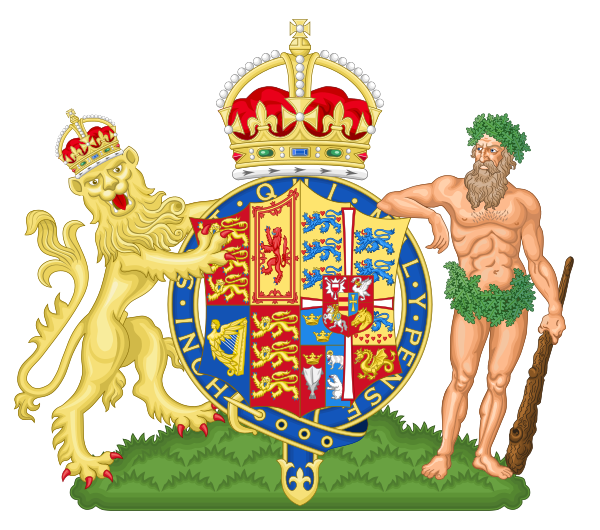 Щит дамский (ромбический), разделён надвое: справа — английский королевский герб (начетверо: в 1-й и 4-й частях в червлёном поле три золотых вооружённых лазурью леопарда (идущих льва настороже), один над другим (Англия); во второй части в золотом поле червлёный, вооружённый лазурью лев, окружённый двойной процветшей и противопроцветшей внутренней каймой [Шотландия]; в третьей части в лазоревом поле золотая с серебряными струнами арфа [Ирландия])[261].
