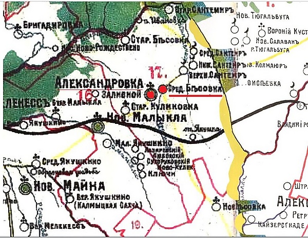 И вот только на «карте Стрельбицкого Восток Европейской части России» 1871 года присутствуют обе деревни. С запада Александровка, на востоке Средняя Бесовка (Дадианово). Речка протекающая по Шишковскому оврагу обозначена как Черная.