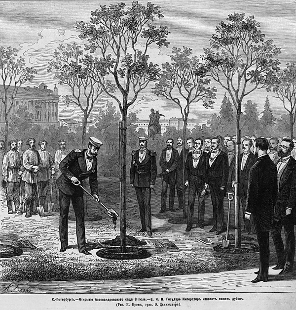 Открылся Александровский сад весьма торжественно, хотя церемония проходила в дождливый понедельник. Приехал сам император Александр II. Выйдя из коляски, он изволил пройти до газона против портала Исаакиевского собора, где лично посадил дубок. Там же дал согласие на название сада своим именем.[3]
