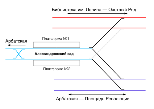 «Александровский сад» — единственная станция с изогнутыми платформами среди станции первой очереди, а также, до 2020 года, она была единственной подземной станцией с береговыми платформами (платформы соединяются арочным мостиком)[4].