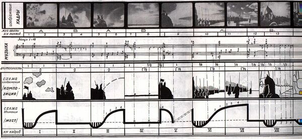 Мы с С. С. Прокофьевым всегда долго торгуемся, кто первый: писать ли музыку по несмонтированным кускам изображения — с тем, чтобы, исходя из неё, строить монтаж, — или, законченно смонтировав сцену, под неё писать музыку. И это потому, что на долю первого выпадает основная творческая трудность: сочинить ритмический ход сцены! Второму уже легко. На его долю остается возвести адекватное здание из средств, возможностей и элементов своей области. Конечно, лёгкость и здесь весьма относительная.