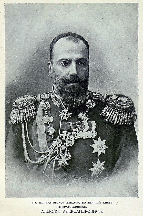 Великий князь Алексе́й Алекса́ндрович (2 [14] января 1850 года, Санкт-Петербург, Российская империя — 1 [14] ноября 1908 года, Париж, Франция) — четвёртый сын императора Александра II и императрицы Марии Александровны. Член Государственного совета (с 1 января 1881 года), главный начальник флота и Морского ведомства и председатель Адмиралтейств-совета (1881—1905), последний генерал-адмирал Российской империи (с 15 мая 1883 года), адмирал (1 января 1888 года), генерал-адъютант (с 19 февраля 1880 года), почётный член Императорского православного палестинского общества[3]. Тезоименитство[4] — 20 мая (перенесение мощей святителя Алексия Московского).