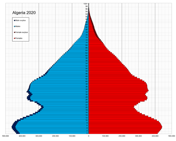 Последняя перепись населения Алжира проведена 16—30 апреля 2008 года[17]. По данным переписи, численность населения страны в 2008 году составила 34 080 030[18] чел. Годовой прирост — 1,2 % (фертильность — 1,8 рождений на женщину). Городское население — 65 % (в 2008). Грамотность — 79 % мужчин, 60 % женщин (оценка на 2002 год).