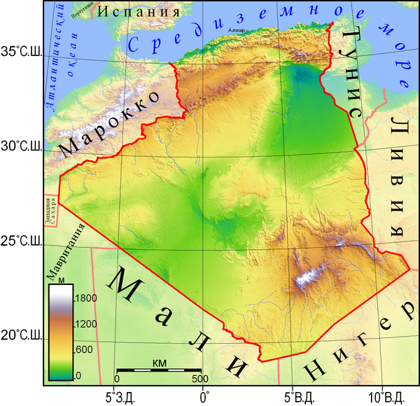Алжир граничит с Марокко на западе, Мавританией и Мали — на юго-западе, Нигером — на юго-востоке и Ливией и Тунисом — на востоке. Бо́льшая часть территории страны лежит в пустыне Сахара. Столица — город Алжир.