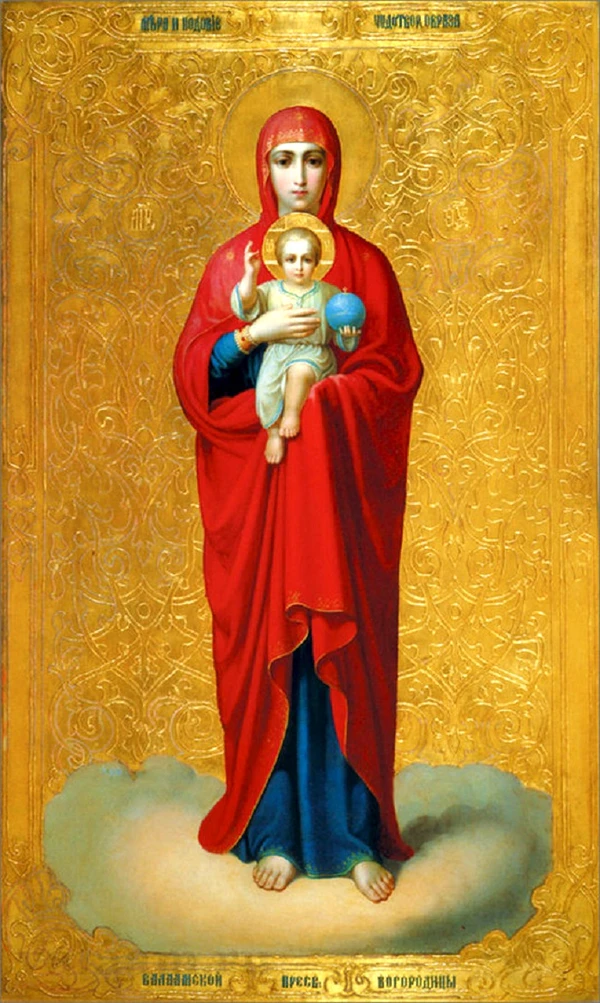 Богоматерь изображена в полный рост на облаке в золотом сиянии, она поддерживает младенца-Христа рукой, скрытой под накидкой снизу, а другой рукой — спереди. Богоматерь словно прикрывает его от будущих страданий. Стопы Богоматери изображены без обуви (что финская исследовательница отмечает как оригинальный элемент в православной иконографии[69]). Правая рука Христа благословляет, в левой он удерживает державу, увенчанную крестом[68].