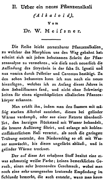 Значительный вклад в химию алкалоидов на заре её развития внесли французские исследователи Пьер Пеллетье и Жозеф Каванту, открывшие, в частности, хинин (1820) и стрихнин (1818). Также в течение нескольких последующих десятилетий были выделены ксантин (1817), атропин (1819), кофеин (1820), кониин (1827), никотин (1828), колхицин (1833), спартеин (1851), кокаин (1860) и другие алкалоиды[20].