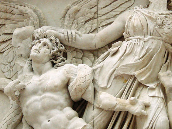 Согласно Пиндару, флегрейский волопас, пытался похитить у Геракла быков Гериона. Воитель, сокрушивший 12 колесниц и 24 бойца. Убит Гераклом с помощью Теламона[2]. Отличался особой силой. Оставался бессмертным на земле, на которой родился. Угнал стадо Гелиоса из Эритеи. Геракл сразил его стрелой, но к нему вновь вернулась жизнь. По совету Афины Геракл стащил его с земли Паллены и убил, из-за этого началась битва с гигантами[3].