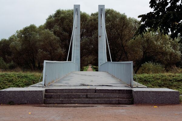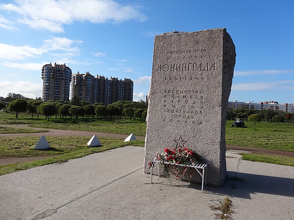 Текст на стеле: «Здесь проходила передняя линия обороны Ленинграда в Великой Отечественной войне 1941—1945 годов».