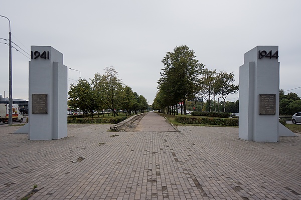 Две стелы в виде пилонов по бокам аллеи с датами 1941 и 1944