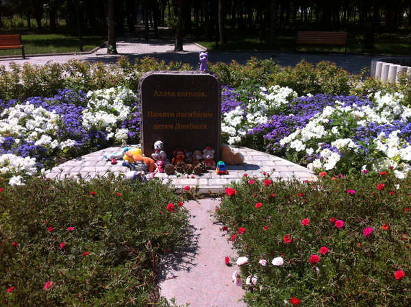 В качестве места установки первоначального памятного знака был выбран сквер парка недалеко от детской Малой железной дороги. Была обустроена площадка, уложена тротуарная плитка и 3 мая 2015 года установлена мемориальная плита из красного токовского гранита, на которой золотыми буквами выбита надпись: «Аллея Ангелов. Памяти погибших детей Донбасса». Открытие мемориала состоялось 5 мая 2015 года.