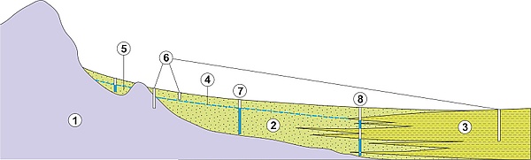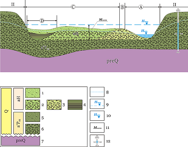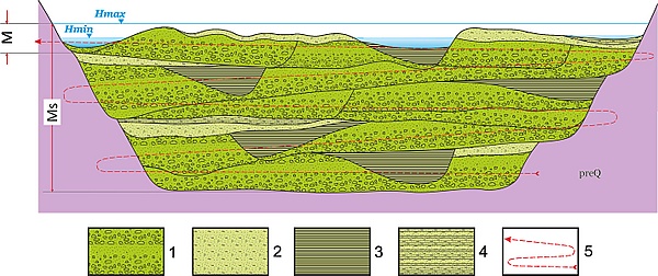 - проточный (нижний): фация сезонного заиления — составлена чередованием тонкозернистых песков, супесей и суглинков, которые образовались во время периодического обновления стока старым руслом во время наводнения или паводка.