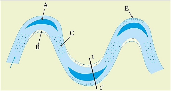 Осадонакопление в меандрах происходит за счёт двух основных факторов — размыва вогнутого берега и откладывания кос (аккумулятивных тел в пределах меандровых петель).