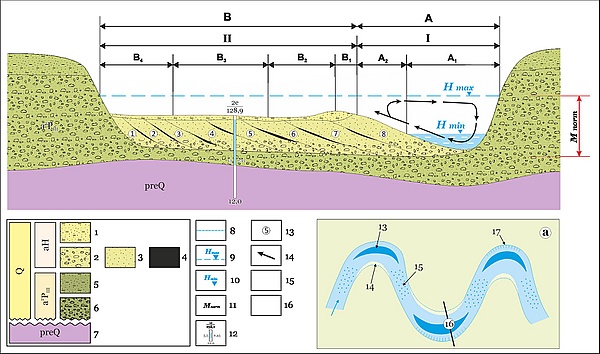 В поперечном сечении реки на изогнутых и прямолинейных участках наблюдается турбулентная вторичная циркуляция водного потока. Следовательно, к вогнутому, глубокому (плёс) берегу приурочен наиболее крупнозернистый аллювий. На выпуклом берегу формируется прирусловая отмель, что составлена хорошо отсортированным мелко- и тонкозернистым песком и ограничена со стороны поймы прирусловым валом. При отступании русла более молодые части прируслового аллювия накладываются друг на друга, образуя серию прирусловых валов. На прямых участках реки между изгибами образуются мелководные перекаты, русло дробится на несколько рукавов, между которыми располагаются островки, где аллювий характеризуется мелкозернистостью и сильной изменчивостью по латерали. Со временем, меандры становятся все более выраженными, образуя расширения и пережатия. При этом плёс берега подвергается эрозии, а на мели — наращивается отмель. Наконец, два пережатия соединяются между собой, и происходит перехват реки, русло выпрямляется, а бывший меандр образует старицу, часто узкой серповидной формы, в которой формируется особая фация аллювия, состоящая из проточной, озёрной и болотной частей.