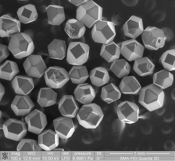 В настоящее время существует крупное промышленное производство синтетических алмазов, которое обеспечивает потребности в абразивных материалах. Для синтеза используется несколько способов. Один из них состоит в использовании системы металл (растворитель) — углерод (графит) при воздействии высоких давлений и температур, создаваемых с помощью прессового оборудования в твёрдосплавных АВД. Алмазы выкристаллизовываются при охлаждении под давлением из расплава, представляющего собой образующийся при плавлении металло-графитовой шихты перенасыщенный раствор углерода в металле. Синтезируемые таким образом алмазы отделяют от спёка шихты растворением металлической матрицы в смеси кислот. По этой технологии получают алмазные порошки различной зернистости для технических целей, а также монокристаллы ювелирного качества.