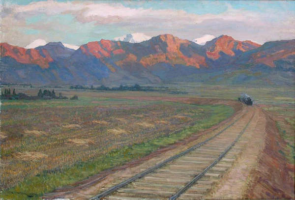 На первом плане справа изображена насыпь с железнодорожными путями, уходящая по диагонали вдаль, что придаёт композиции динамику. У поворота путей виден поезд. Левее располагаются желто-зелёные поля, перемежающиеся полосами лесонасаждений. На дальнем плане возвышается гряда высоких розово-сиреневых гор, за которыми виднеются отдельные заснеженные вершины, что характерно для горного пейзажа. Небо выполнено в зеленовато-голубых тонах с розовыми облаками, что подчёркивает выразительную цветовую гамму работы.