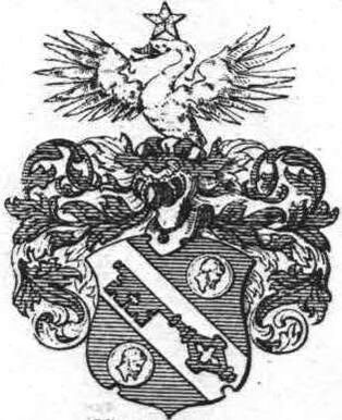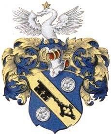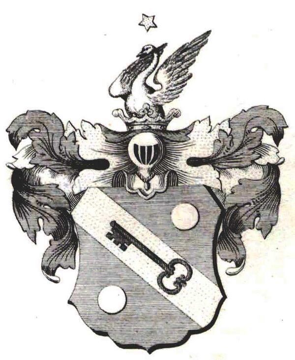 В голубом поле золотая перевязь вправо, обременённая чёрным ключом и сопровождаемая двумя серебряными «рейхсталерами». В нашлемнике возникающий серебряный лебедь, увенчанный упавшей пятиконечной золотой звездой (северная звезда). Намёт голубой с золотом.