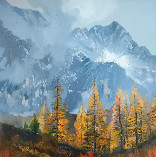 На картине представлен горный пейзаж с выраженной глубиной пространства. На переднем плане изображён склон, покрытый пожелтевшей травой, за которым следуют деревья с золотистыми кронами на среднем плане. Дальний план занимает массив гор с покрытыми снегом вершинами и склонами. Над пейзажем простирается светло-голубое небо с лёгкими облаками. В работе преобладает холодный колорит цветовой гаммы.