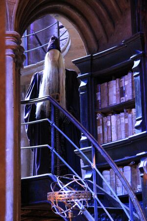 Альбус Дамблдор, директор школы чародейства и волшебства «Хогвартс». Считается величайшим волшебником и гением волшебства. Профессор знаменит своей победой над тёмным волшебником Грин-де-Вальдом в 1945 году, открытием двенадцати способов применения крови дракона и своими трудами по алхимии в соавторстве с Николасом Фламелем. Хобби — камерная музыка и игра в кегли.