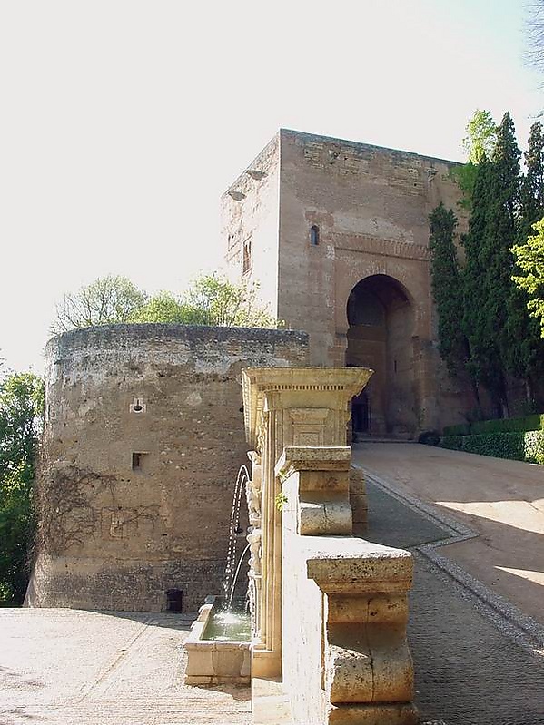 - Ворота Справедливости (Puerta de la Justicia), или Ворота Эспланады (Puerta de la Explanada), поскольку в своё время перед ними простиралось обширное пространство, — вход в Альгамбру из Альгамбрского леса. Возведены в 1348 г. Над внешними воротами есть арабское изображения руки (возможно, руки Фатимы, дочери пророка), над внутренними — ключа, а также статуя Мадонны в нише, сделанная Роберто Алеманом уже по указанию Католических королей.