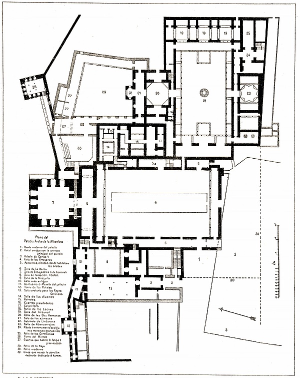 Состоит из трех монументальных ансамблей: Мешуара — здания для аудиенций и судов, дворца Комарес — официальной резиденции эмира, Дворца Львов — частных апартаментов.