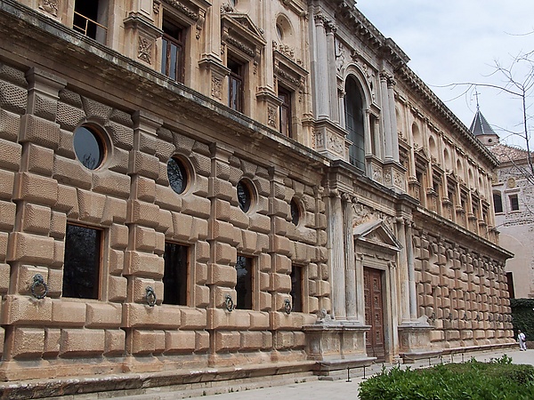 Дворец Карла V (Palacio de Carlos V) начал строиться архитектором Педро Мачука для императора рядом с дворцами Насридов в 1527 г., но в 1568 г. строительство было приостановлено на 15 лет из-за восстания морисков. Ренессансная архитектура дворца в духе итальянского маньеризма (архитектор долго жил в Италии) резко контрастирует с соседними постройками. После смерти Педро Мачука в 1550 г. работы продолжил его сын Луис (построивший круглый двор), здесь работали также Хуан де Ореа и Хуан де Минхарес. Впрочем, дворец достраивался до самого 1957 г., отчего носит отпечаток разных эпох. Дворец квадратный в плане (63 х 17,4м), но имеет внутренний круглый двор (диаметром 30 м). Имеет два этажа, на фасадах которых пилястры чередуются с парами окон — прямоугольным и сверху круглым. Первый этаж выполнен в стиле тосканского ордера и рустован, к пилястрам прикреплены декоративные железные кольца для привязывания коней. На втором этаже сделан ряд балконов, его окна богаче украшены, пилястры — ионического ордера. Парадный вход с восточной стороны выделен четырьмя группами дорических колонн, на фронтоне над главной дверью — аллегорическая фигура Гранады. Со двора оба этажа образуют галереи, первый — с дорическими колоннами, второй — с ионическими.