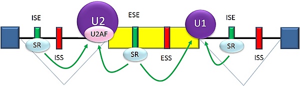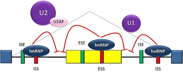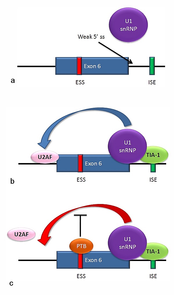 Донорный сайт, расположенный на 5'-конце интрона, следующим после экзона 6 в пре-мРНК, плохо согласуется с консенсусной последовательностью сплайсинга, и не всегда связывается с snRNP U1[5]. Если связывания U1 не происходит, экзон 6 пропускается (картинка а на рисунке справа). Связывание белка TIA-1 с интронным энхансером сплайсинга стабилизирует связывание U1. Образующийся на 5'-конце интрона донорный сайт помогает связываться фактору сплайсинга U2AF с 3'-сайтом сплайсинга, расположенным выше экзона, хотя механизм этого ещё не понятен (картинка b на рисунке справа)[39]. Экзон 6 содержит обогащённый пиримидинами сайленсер сплайсинга (ure6), с которым может связываться PTB. Если связывание PTB имеет место, то донорный сайт на 5'-конце интрона не способствует связыванию фактора U2AF, и экзон пропускается (картинка с на рисунке справа).