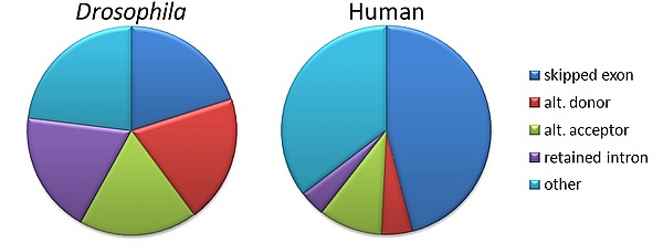 Исследования в рамках проекта «Геном человека», а также других проектов по секвенированию геномов показали, что геном человека всего лишь на 30 % больше генома нематоды Caenorhabditis elegans и всего лишь в два раза больше, чем у плодовой мушки Drosophila melanogaster. Эти данные наводят на мысль, что сложность человека и позвоночных животных вообще может быть связана с более активным, по сравнению с беспозвоночными, использованию альтернативного сплайсинга[47][48]. Однако дальнейшее изучение геномных последовательностей человека, мыши, крысы, коровы, D. melanogaster, C. elegans и растения Arabidopsis thaliana показало, что между человеком и другими эукариотами не наблюдается значительной разницы в использовании альтернативного сплайсинга[49]. Имеются, впрочем, сведения, что полученные данные представляют собой артефакт, связанный с неравномерным включением в сравнительный анализ последовательностей комплементарной ДНК, взятых у различных организмов. При сравнении частот использования альтернативного сплайсинга для случайных выборок генов, полученных от сравниваемых организмов, оказалось, что у позвоночных альтернативный сплайсинг всё же встречается чаще, чем у беспозвоночных[50].